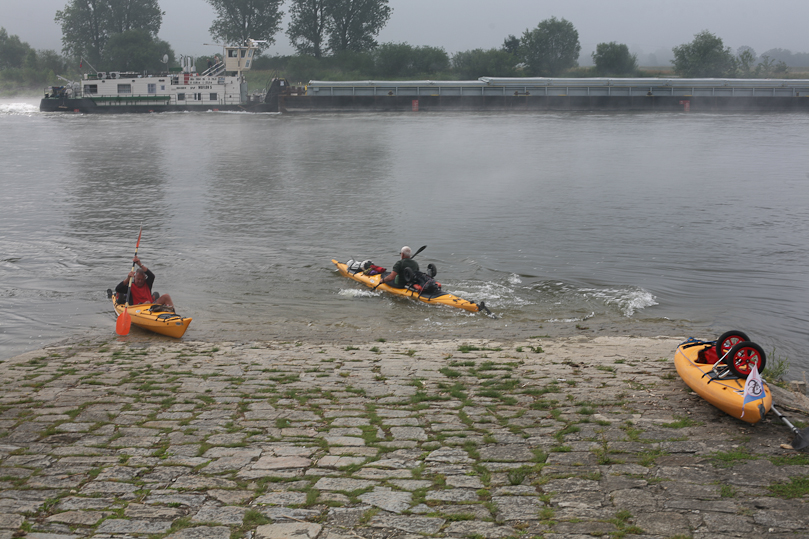 Start in Winzer. Der Schubverband wird gleich eine ordentliche Welle erzeugen. Deshalb ist Eile angesagt.