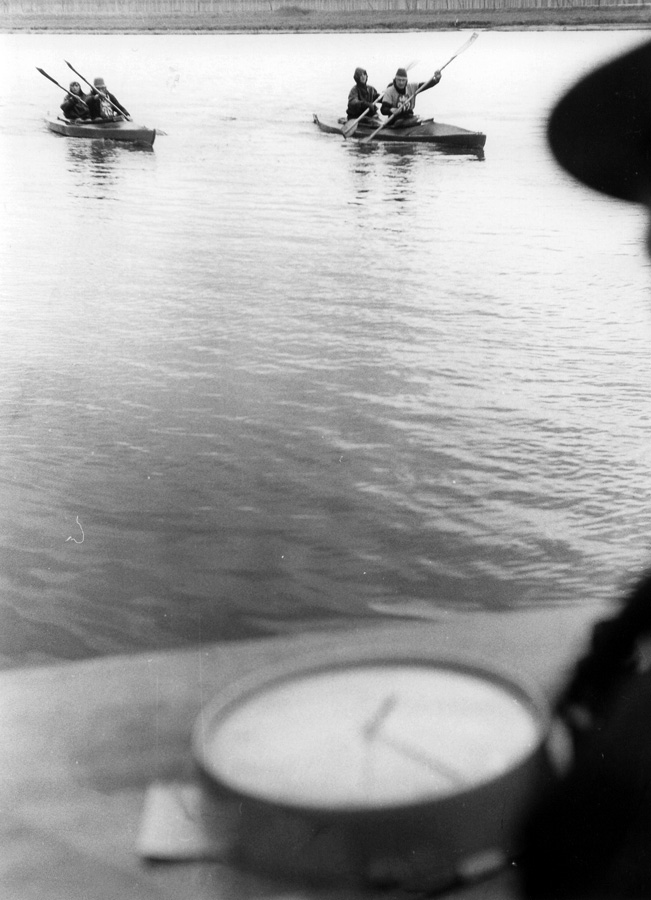Zieleinlauf vor Grimma, bis hier waren je nach Wasserstand ca. zwei Stunden härteste Arbeit gegen die Uhr angesagt. Seinen unmittelbaren Gegner sah man nicht, und die endgültige Platzierung wurde unter Addition der Slalomzeit mit eventuellen Strafsekunden für die Stangenberührung manuell im Orgbüro ausgerechnet. Am Abend zum Kanutenball standen die Sieger fest.