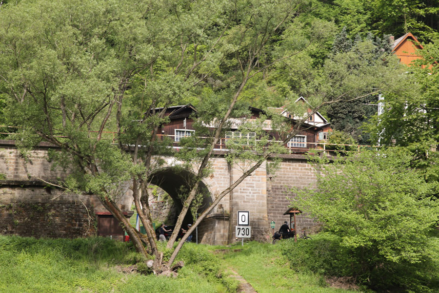 An der Gelobtbachmühle bei Schmilka beginnt Deutschland. Die Elbe wird bis hier abwärts kilometriert, es sind noch 730 km bis Cuxhaven. In Deutschland verläuft die Kilometrierung aufsteigend. Das erste Schild ist die "0".