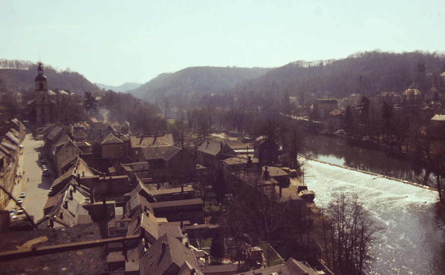 Vom öffentlich nicht zugänglichen Rathausturm hat man einen Blick auf die Waldheimer Oberstadt und das Wehr, in dessen Unterwasser am Karfreitag der Kanuslalom stattfinden wird.