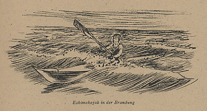 Hier draußen in der Brandung hatten sie in den letzten Tagen sich auch ein anderes Spiel ausgesonnen. Sie hatten den Eskimokajak hinübergetragen und versuchten, damit durch die Brandung zu fahren, wenn die See nicht zu grob war. Hier bewies der Kajak seine wunderbare Bauart. So rank und unsicher er in ruhigem Wasser war, hier sprang er die anrollenden Brecher an, durchbohrte und überkletterte sie, daß es eine Lust war. Alle drei zankten sich oft darum, wer damit fahren dürfe.