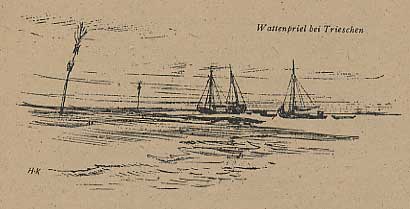 Sie eilten sehr, denn das Wasser fiel schnell. Aber der Priel wurde auch rasch tiefer und größer, und nun kam der glückliche Moment, wo sie wieder einsteigen konnten. Mit raschen Paddelschlägen fuhren sie, unterstützt von der Ebbströmung, den Priel hinab. Nach einigen Windungen mündete er in einen großen Wattstrom. Das mußte ja nun die Außeneider sein! Aber dann würde eigentlich drüben schon das Eiderstedter Ufer liegen, und da war doch eine große, graue, hohe Wattbank!?