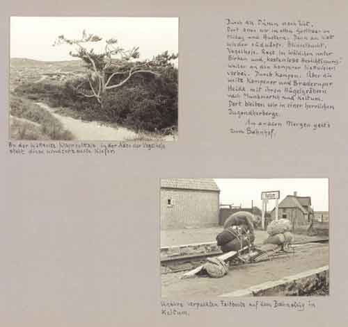 Dort aßen wir im alten Gasthaus zu Mittag und Austern. Dann am Watt wieder südwärts. Blidselbucht. Vogelkoje. Rast im Wäldchen unter Birken und "kostenlose Besichtigung". Weiter an den Wattwiesen vorbei. Durch Kampen. Über die weite Kampener und Braderuper Heide mit ihren Hügelgräbern nach Munkmarsch und Keitum. Dort bleiben wir in einer herlichen Jugendherberge.
